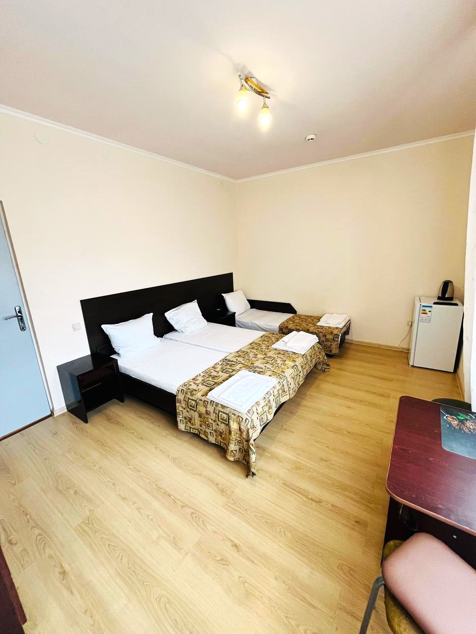 стандарх 2-х, 3-х и 4-х местные номера: кровати односпальные 2 шт. (или двухспальная кровать 1 шт) / кровати односпальные 3 шт. (или двухспальная кровать 1 шт. и односпальная кровать 1 шт.) / кровати односпальные широкие 2 шт. (или двухспальная кровать 1 шт), двухъярусная кровать длина 2,1 метра